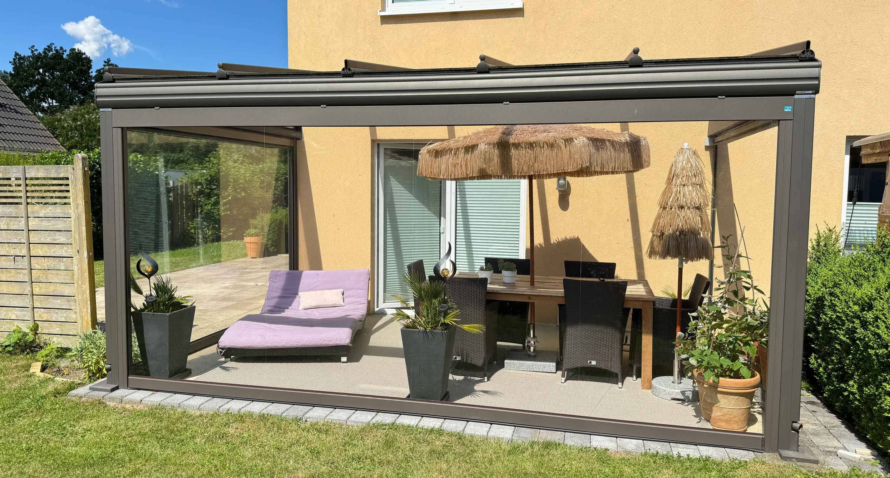 Ihr Weg zum „Wintergarten-light“ mit dem Wetterschutzrollo für Terrasse, Balkon oder Pergola.